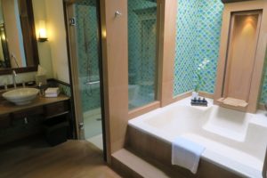 スタンダードタイプの部屋の大きな違いはバルコニーともうひとつはバスルームでしょうか。こちらはいかにもリゾートらしい造りのバスルームです。 天窓がひかりが降り注ぐバスルームは夜よりも昼に入るのが気持ち良いですね。 バスタブは2人はゆうに入れる大きさ。お湯は旅館のお風呂のような感じで出てきます。白いのは入浴剤を入れたからでもちろん温泉ではありません(笑)。 洗面カウンターはシンメトリーで配置されていま … 続きを読む 天窓から光の入る広いバスルーム インターコンチネンタルパタヤにて(タイ パタヤで年越し2016-2017 その10)