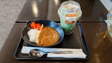 サクララウンジとの大きな違いは軽食が置いてあることです。福岡空港限定の熊本産「万次郎かぼちゃ」を使用したポタージュ、「三日月屋」のクロワッサン、博多いもっ子屋の「明太子」と「鶏めし」のおにぎりとみそ汁、「あまおうジャム」使用のデニッシュ、たっぷりの三池高菜入りのソフトフランスパン、羽田と同様の焼きカレーパンもあります。