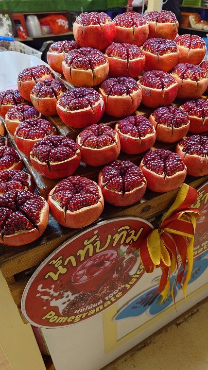 ザクロですかね。バンコクの街角でもザクロジュースを販売しているのをよくみかけますね。タイではザクロは子孫繁栄の縁起物の意もあるそうです。
