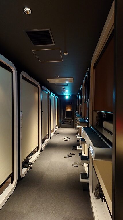 翌朝一番の飛行機に乗らないといけない日に、ここなら寝過ごす可能性も低いだろうと最近那覇空港にもできたファーストキャビンを利用しました。場所は那覇空港の国際線側です。JALの出発・到着ゾーンからは一番遠くて早足でも6〜7分はかかります。