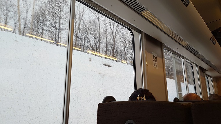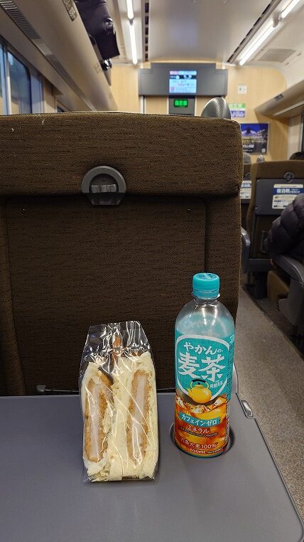 札幌駅の自販機で購入したサンドリアのサンドイッチを食べながら移動。