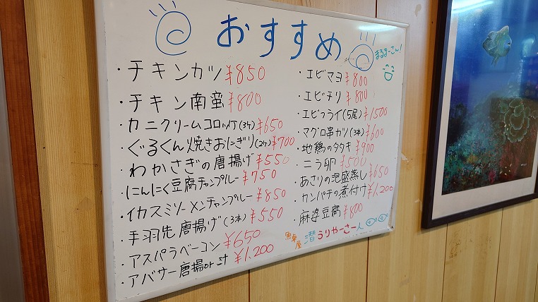 本日のおすすめメニュー。石垣島の居酒屋って何故かエビマヨとエビチリがあるところが多いような・・・気のせいかな。エビフライも結構見かけますね。エビの養殖とかやっているのでしたっけ? それとも台湾から運ばれてくる?