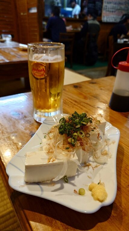 まずはオリオンビールと冷奴で。もちろん島豆腐ですよ。かなり巨大なのが来てしまいました。