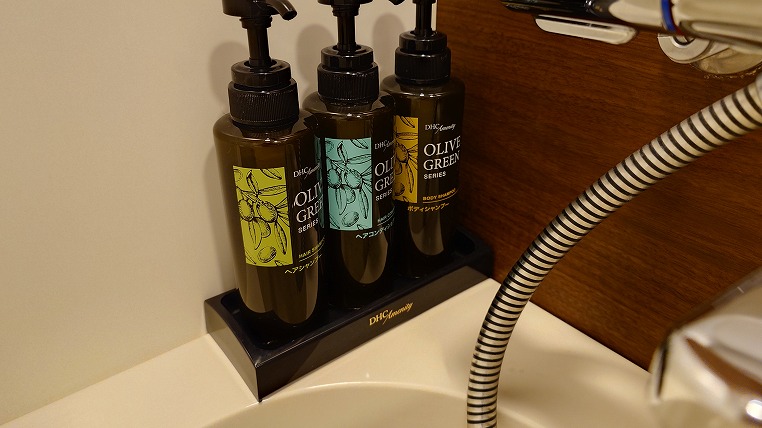 シャンプーやコンディショナー、ボディソープはDHCのものです。リンスインシャンプーとかでないのも好印象です。