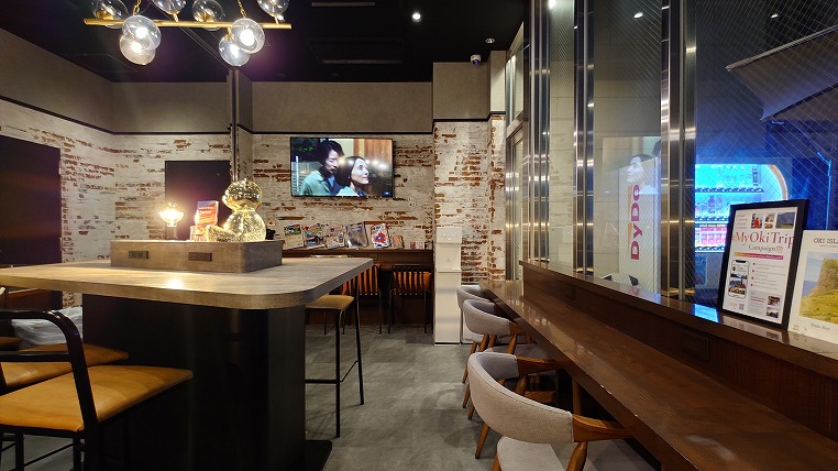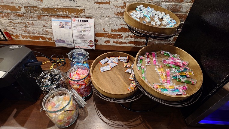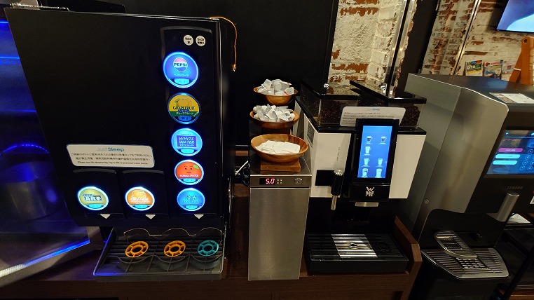 1階ロビー奥には朝食会場にもなるスペースがあり、夜時間帯は駄菓子やソフトドリンク、コーヒーが飲み放題となっています。