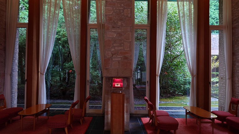 ザ・プリンス箱根といえばこの館内風景は外せません。設計は都ホテルやプリンスホテルの建築を多く手がけている建築家 村野藤吾によるものです。椅子の座面が低くなっているのはおそらくはこの天井を広く高く見せるためでしょう。そしてその天井はまるでタープのように弧を描いています。