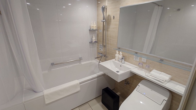 バスルームは広めのユニットタイプ。リニューアルされてキレイですし、バスタブも大きめです。バスルーム手前の謎のスペースも考えると洗い場付きにもできたような気がしますがもったいないですね。