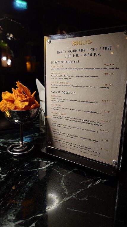 ハッピーアワーは時間も長めでしたし価格も今のバンコクの物価(と円安)を考えるとこんなものでしょう。もちろんこちらを利用しました。海外によくある1杯飲むともう1杯無料というパターンです。