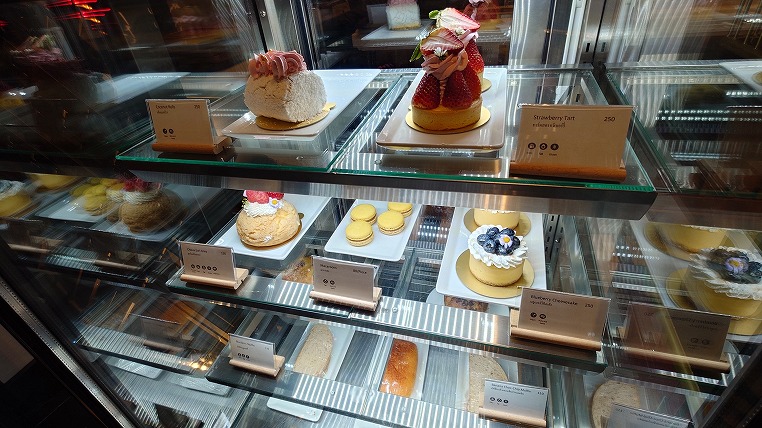 バーを出て再びエントランス階へ。カフェスペースには美味しそうなケーキが並んでいます。