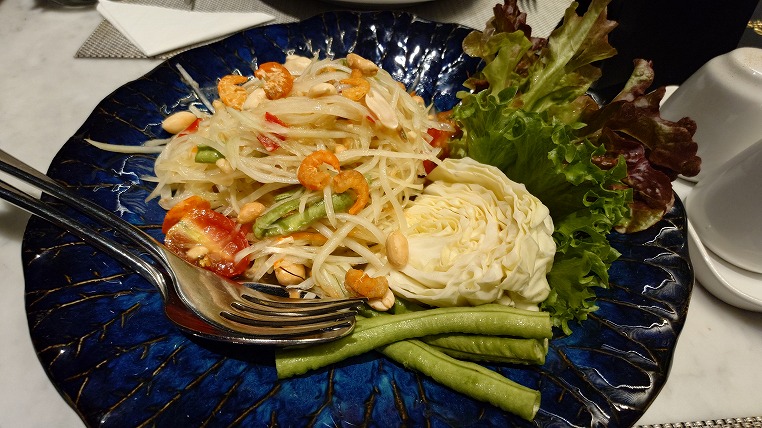 好きな大量の一つソムタム。体中から汗がジワリと出てくるような辛さです。これでも中くらいの辛さにはしたのですが。