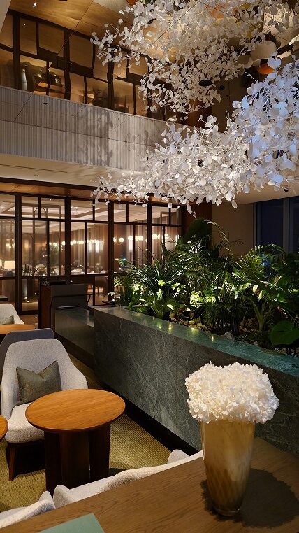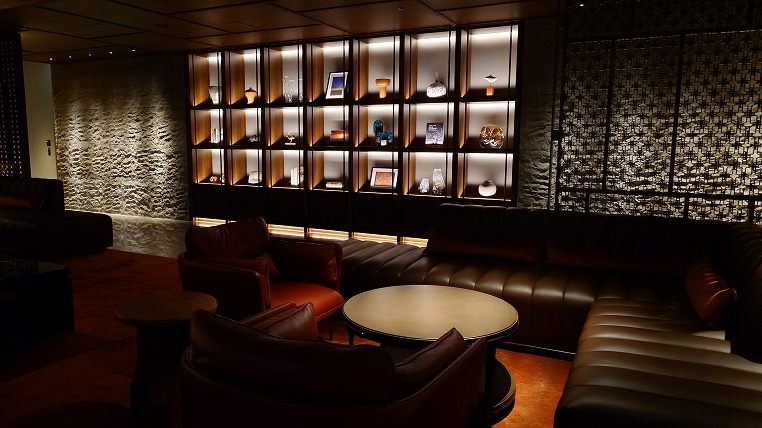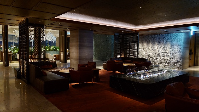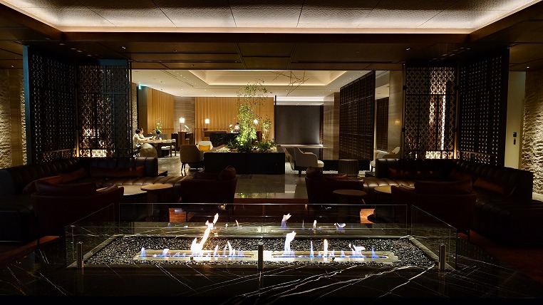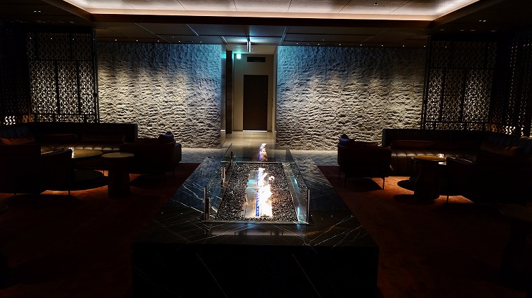 夜遅い時間帯のロビーエリア。さすがにもうゲストが少なくバイオエタノール暖炉の炎がゆらめくのみです。