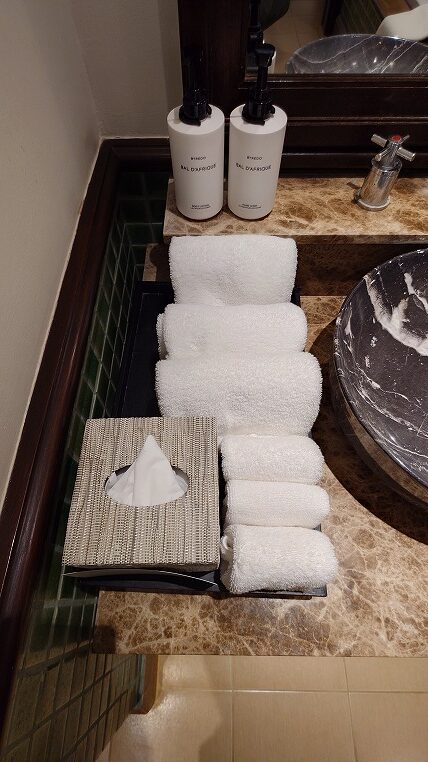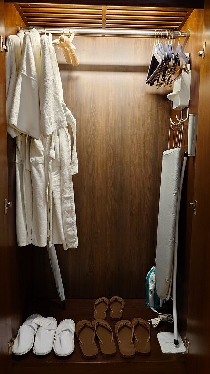 こちらは本来3名用の部屋でもあるわけですね。バスローブやスリッパ、サンダルも3つずつあります。