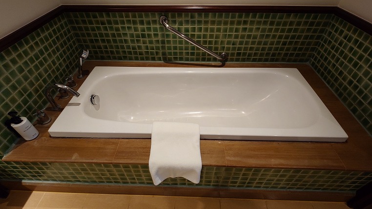 海外によくある底の浅いバスタブ。あまり入った気がしません。