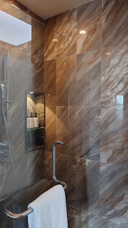 大理石調タイルが張られたシャワーブース。