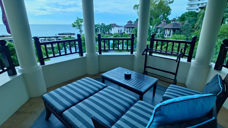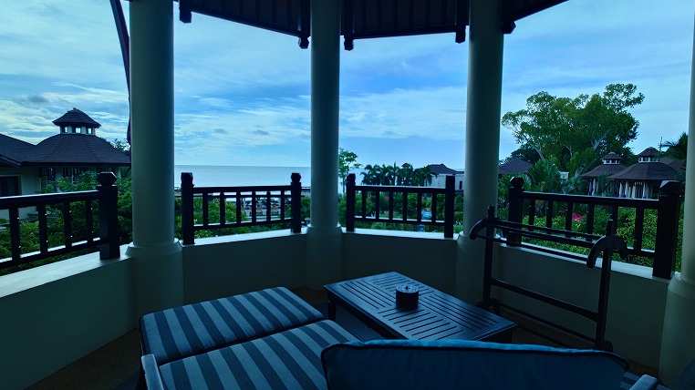 部屋付属のベランダ、タイ風の東屋(サーラータイ)にて。ちなみに細かい話ですが、ベランダーは手すりのある屋根付きの屋外スペース、その屋根のないのがバルコニー、1階にあるものがテラスです。建物の構造体の中にあるものをインナーバルコニーと呼んだりするので最近は境目が曖昧になっていますけど。