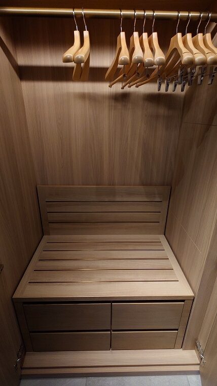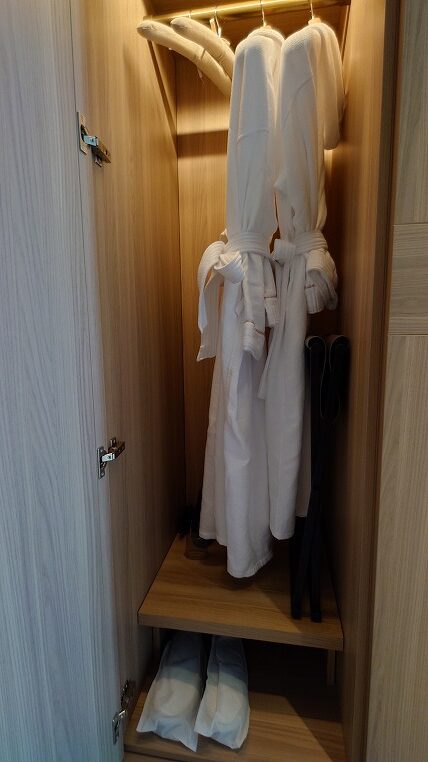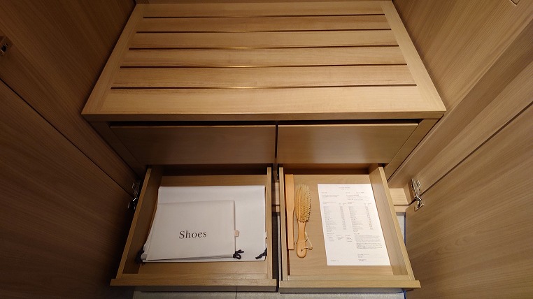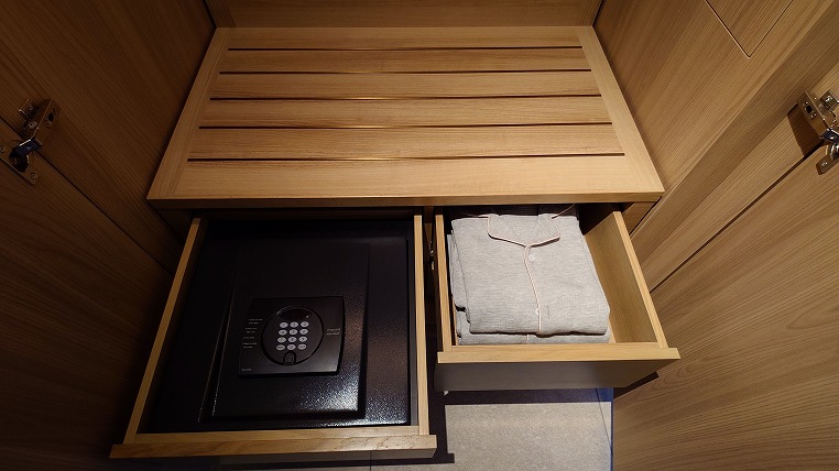 クロゼット内の引き出し1段目にはそれぞれ金庫、ナイトウェアがはいっています。ナイトウェアもペラペラではなくて高級感のあるものです。