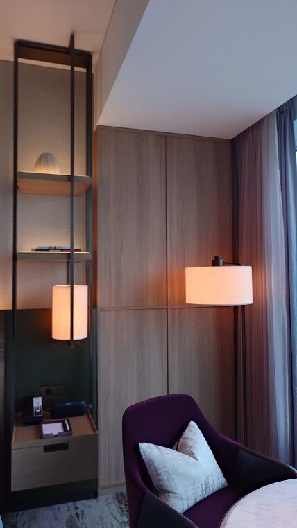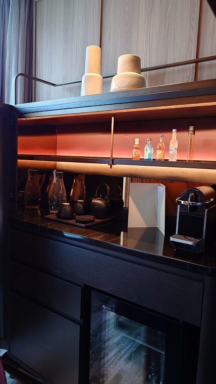 横浜のPier8もそうですが最近のインターコンチネンタルはミニバーの造作に凝ったものが多いですね。きれいに並べられたグラスがインターコンチネンタルらしいトラディショナル感を演出しています。このあたり基本的に保守的なブランドですね。