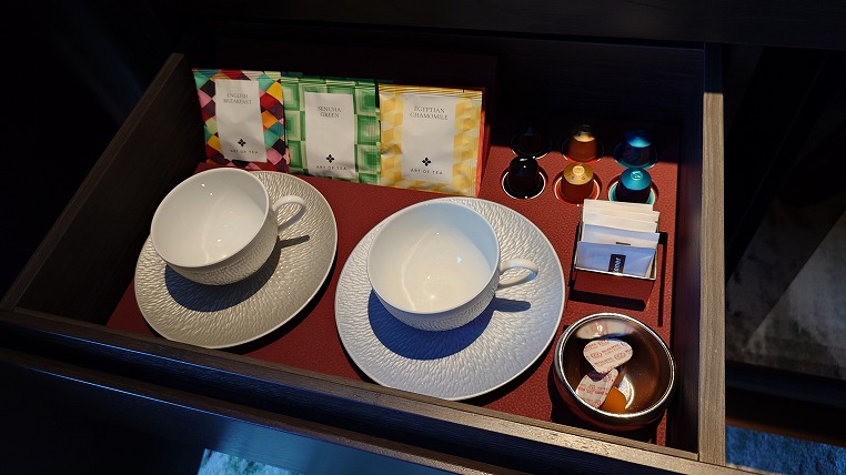コーヒーカップはインターコンチネンタル石垣と同じものです。ティーパックはロサンゼルスのお茶のブランド「Art of Tea」です。珍しくTWGではないのですね。もちろんネスプレッソカプセルもあります。