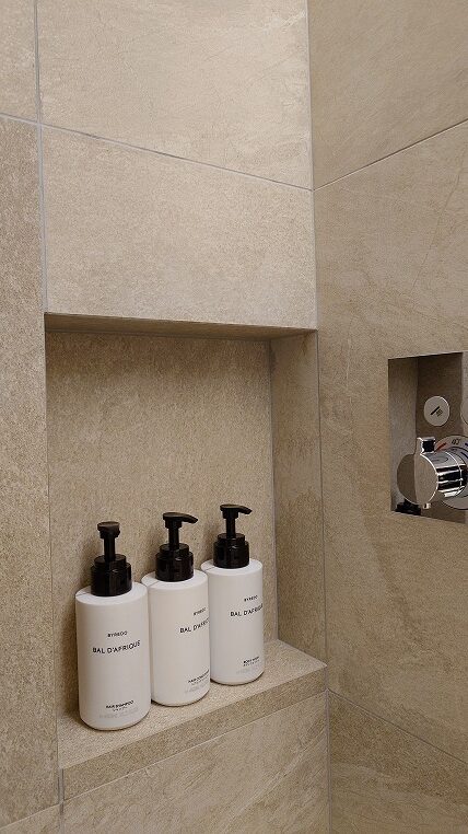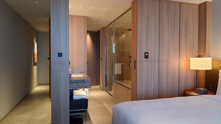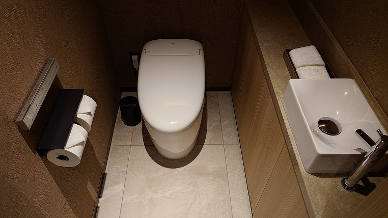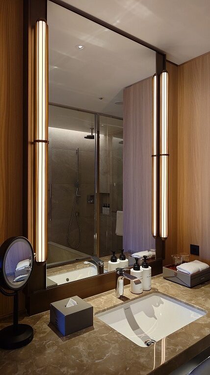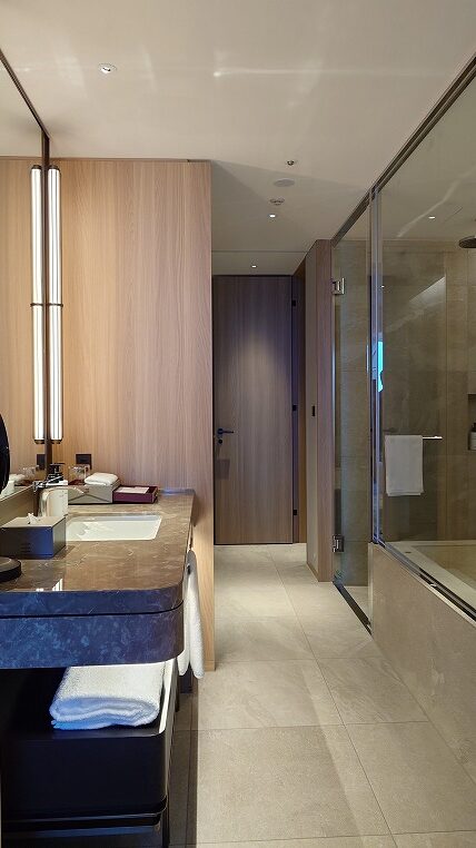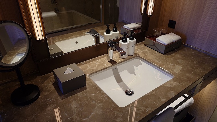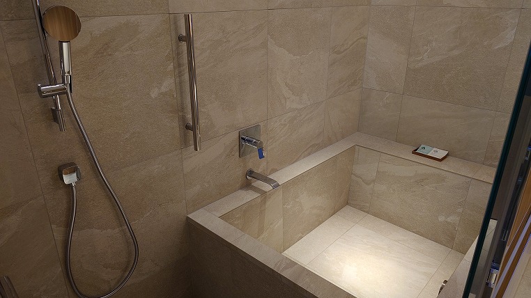 バスルームはホテル・ザ・ミツイ京都のそれに少し似ています。2人が余裕で同時に入れる大きさです。