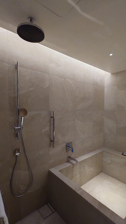 シャワーは天井からのレインシャワーとハンドシャワーの2系統。