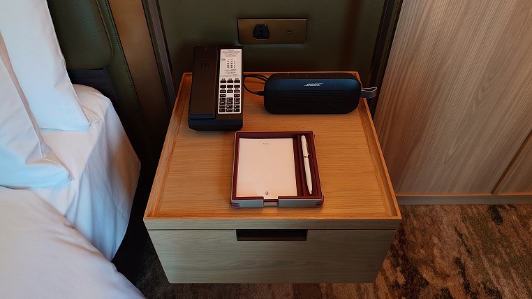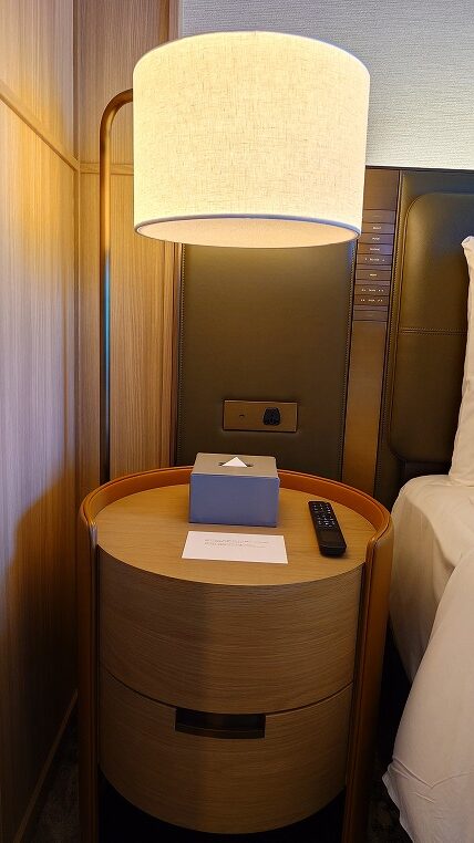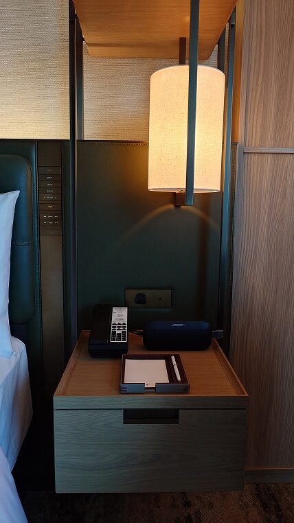 ベッドサイドにはBluetoothスピーカーも置かれていました。最新ホテルですから照明等のスイッチも洗練されていますね。ちなみにUSBはType-Cです。JALの最新型A350-900の座席のUSBは何故Type-A型にしたのでしょうね。