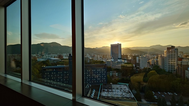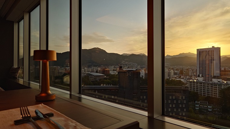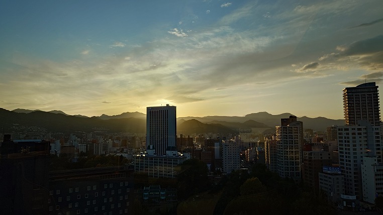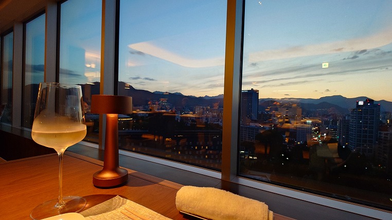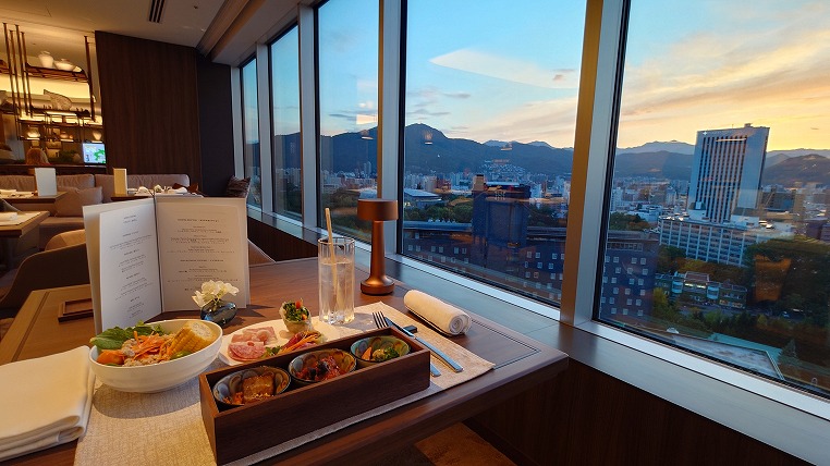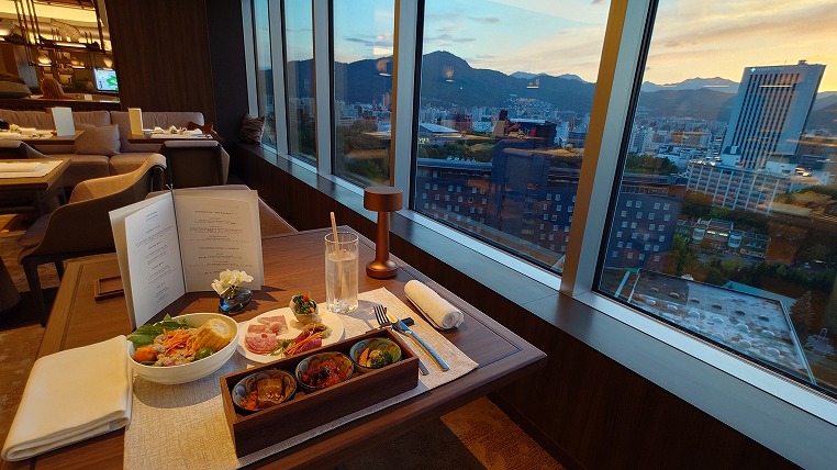 ラウンジのパノラマウィンドウからは札幌の街の夕暮れがキレイに映っています。