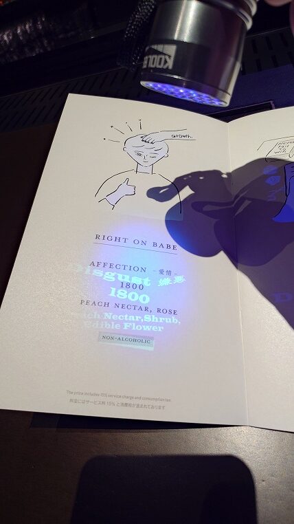 ブラックライトをあてるともうひとつの裏の意味のカクテルも映し出されますよ。