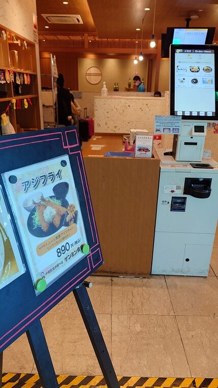 入口でメニューを選んで機械で精算するのは空港食堂と同じです。ただしこちらは整理番号で呼ばれるのが自動になっています。