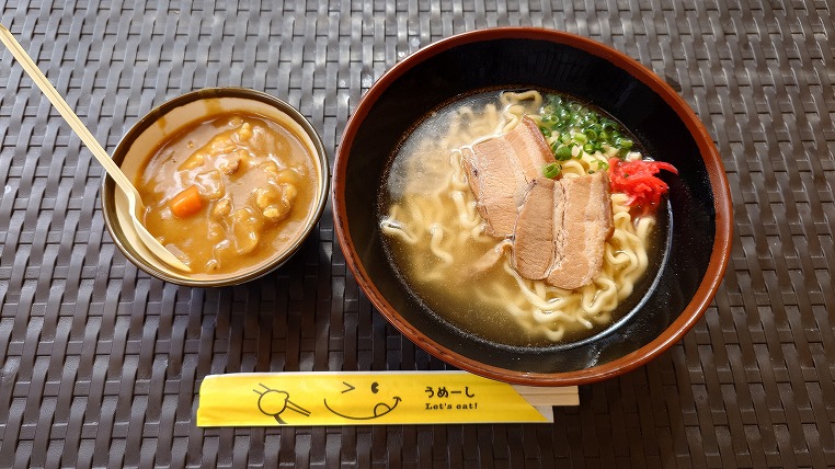 タコライスと沖縄そばといきたいところですがあまり時間もないですし、カレーの場合はミニセットがあるのでそちらにしました。沖縄そばはあっさりとした仕上がりで朝にもちょうど良く、カレーは思ったよりはスパイシーでした。