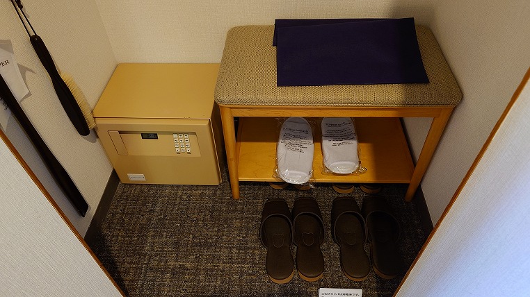 スリッパは使い捨てのものと厚手の繰り返し使用するタイプと2種類。金庫もかなり年季が入っています。