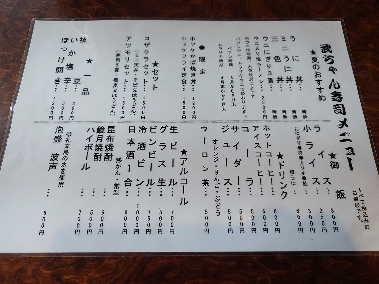 エゾバフンウニはなかったですが、エゾムラサキウニならあるとのこと。不漁ということはウニもそれほど新鮮ではないだろうと推測しミニサイズのほうを注文しました。正確な値段を忘れましたがこの日はムラサキのミニが3500円ぐらいで、フルサイズが5000円台だったと思います。