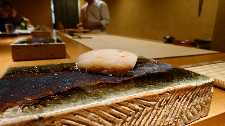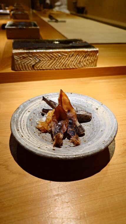 鮨をのせる焼物のお皿というか台というか。こちらはオーダーで焼いてもらったものと聞いたように記憶しています(違ったらすみません・・・)。