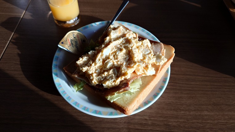 パンではさんでしまうと朝食ビュッフェを色々と食べた後ではヘビーになりすぎるためオープンサイドにして食べました。