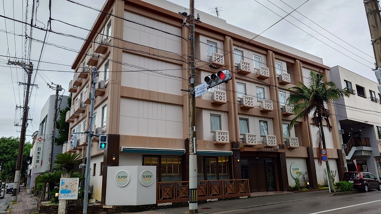 こちらがスーパーホテル石垣島。まず外観からして全くスーパーホテルっぽくありません。写真を撮り忘れましたがロビーも家族経営の旅館みたいなフロントですし、客室へ向かう廊下も外廊下です。なんとなくですがワンルームマンションを改装したのかなという感じの構造です。