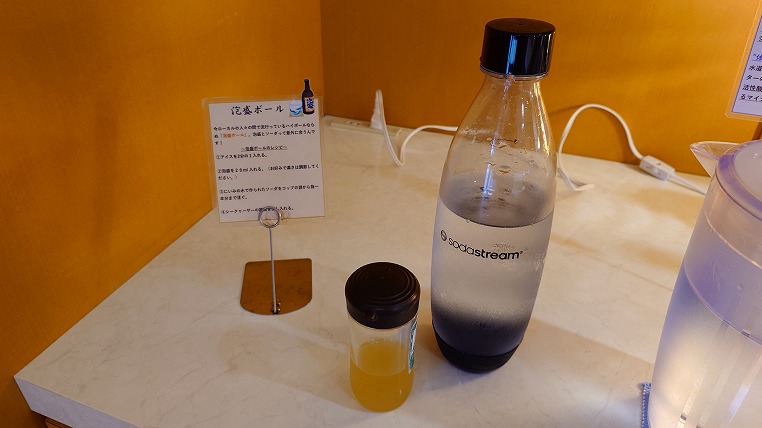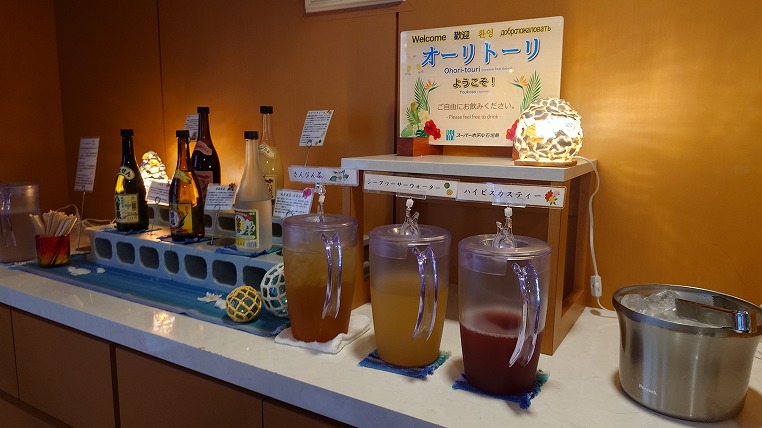 こちらは夕方以降に自由にお酒を楽しめるスペースがあります。沖縄なので泡盛が中心です。ソフトドリンクもさんぴん茶や、シークァーサー、ハイビスカス等があるのがうれしいですね。